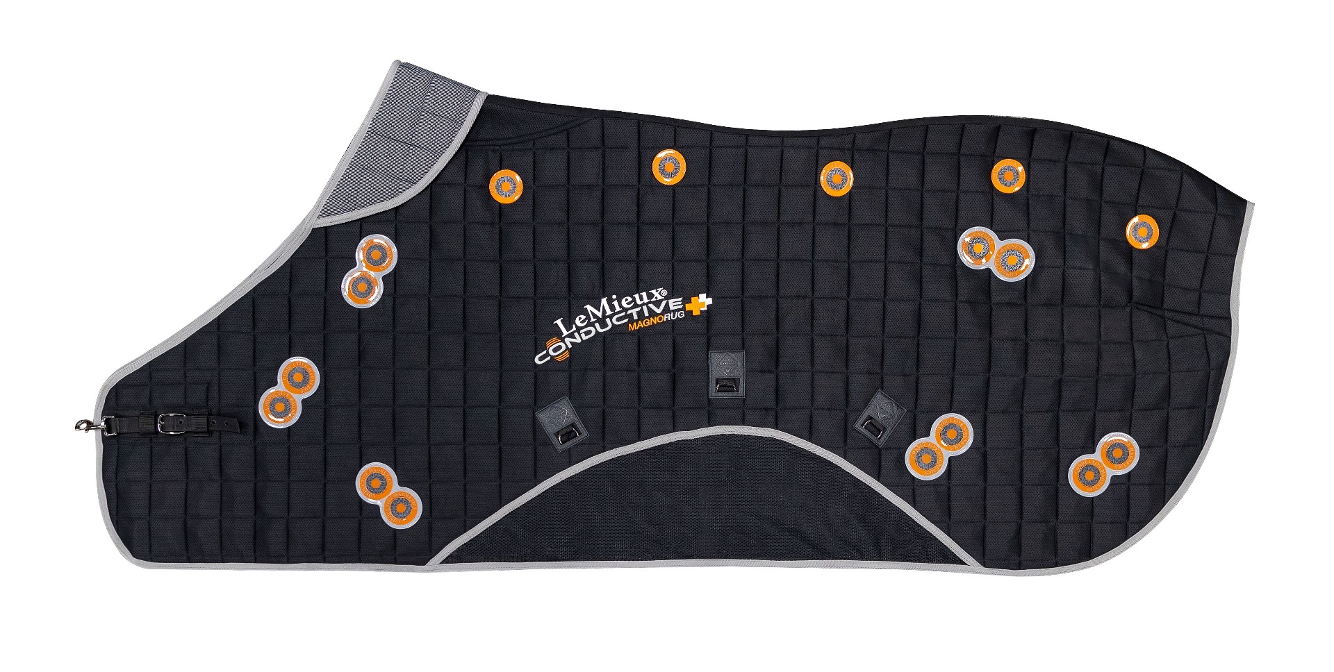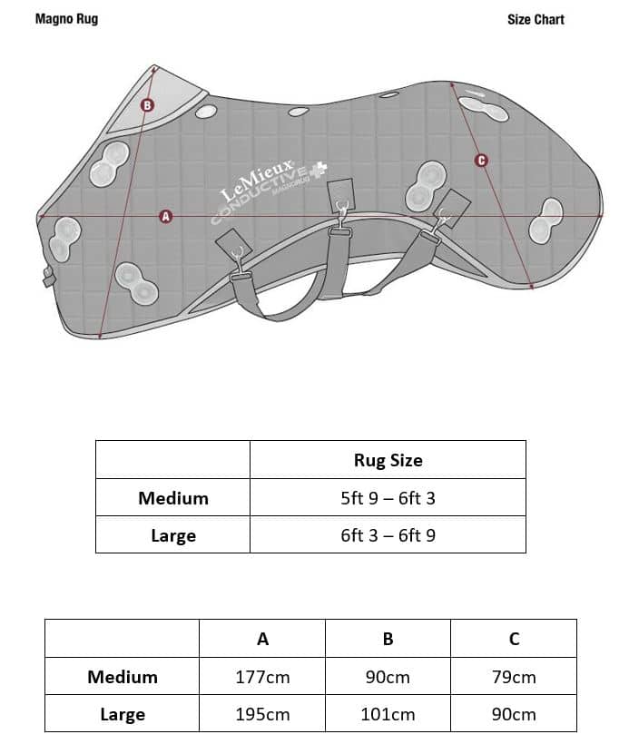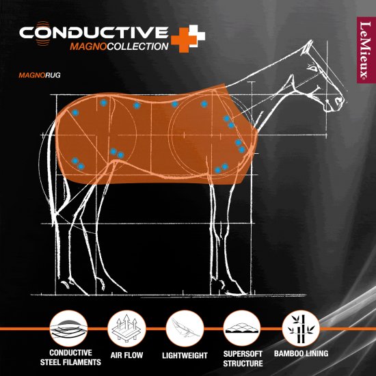 The LeMieux Conductive Magno Rug heralds a new approach to magnetic care. Unique inner liners contain a woven layer of steel fibres directly under powerful 2600 Gauss twin magnets which are strategically placed over 5 key areas: