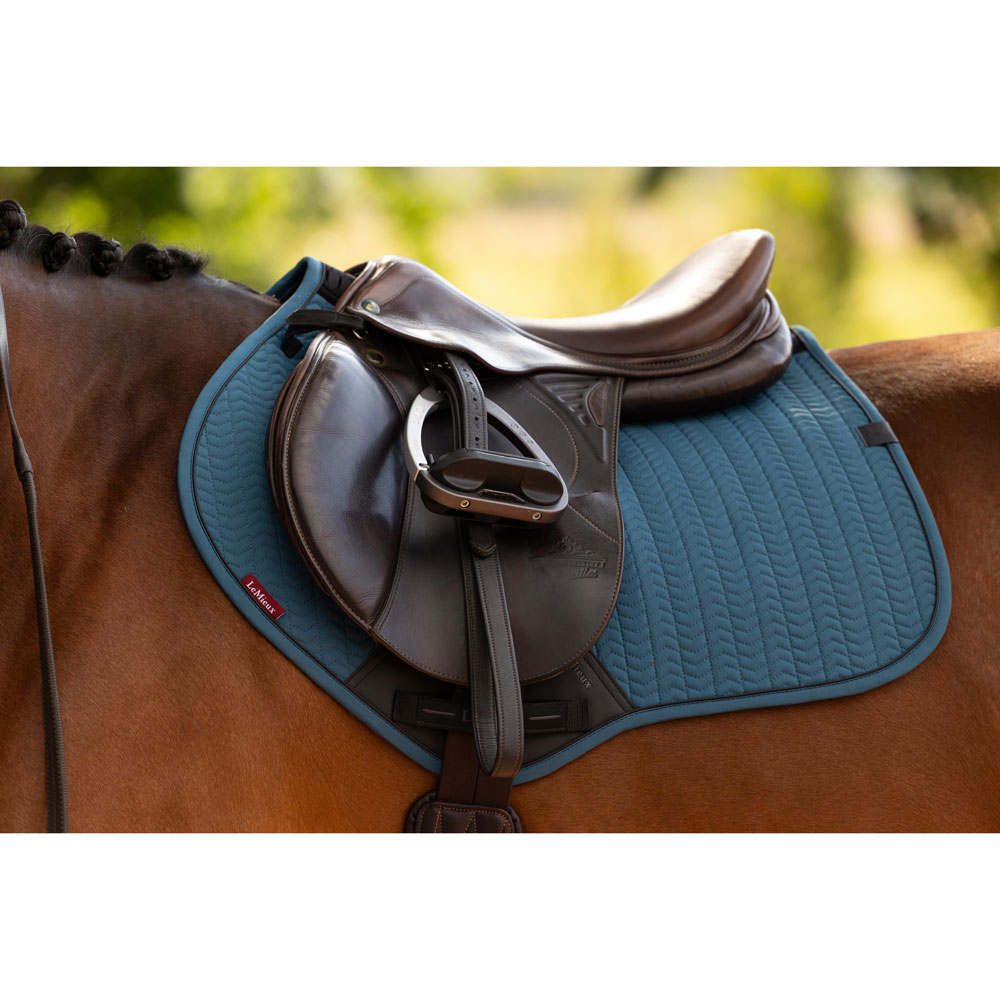Designed for elite riders with technical performance that everyone can enjoy, the soft shell fabric of the Finesse Collection of saddle pads exudes class. The contour quilted soft shell upper, meticulously designed to hug your horse’s curves without wrinkling, is teamed with a soft, breathable self-cool lining. The cooling material is woven with cooling fibres, controlling heat by transferring heat away from the skin and wicking sweat efficiently to cool your horse. The warmer your horse gets, the harder the moisture-activated cooling lining works under the saddle. Combined with a full 3D carbon mesh spine for maximum airflow, this is a saddle pad uniquely designed for hardworking horses. The high wither shape reduces pressure and enhances your saddle’s fit. Elasticated saddle straps, thoughtfully designed to be slimmer at the point of connecting to the D-ring, leave room for extra accessories catering to your specific training needs. The whole pad benefits from extensively researched, soft, friction-free binding that is specially fabricated to contour the edges smoothly. This technique helps retain the perfect saddle pad shape and binding profile. Sporty rubberised piping gives the pad a clean, athletic aesthetic. The sporty matte-textured faux leather girth protection area is complemented by an embossed logo. Our signature LeMieux hidden girth loop channels mean you can precisely place your girth. A unique LeMieux branded faux leather tab provides a luxurious finishing touch.